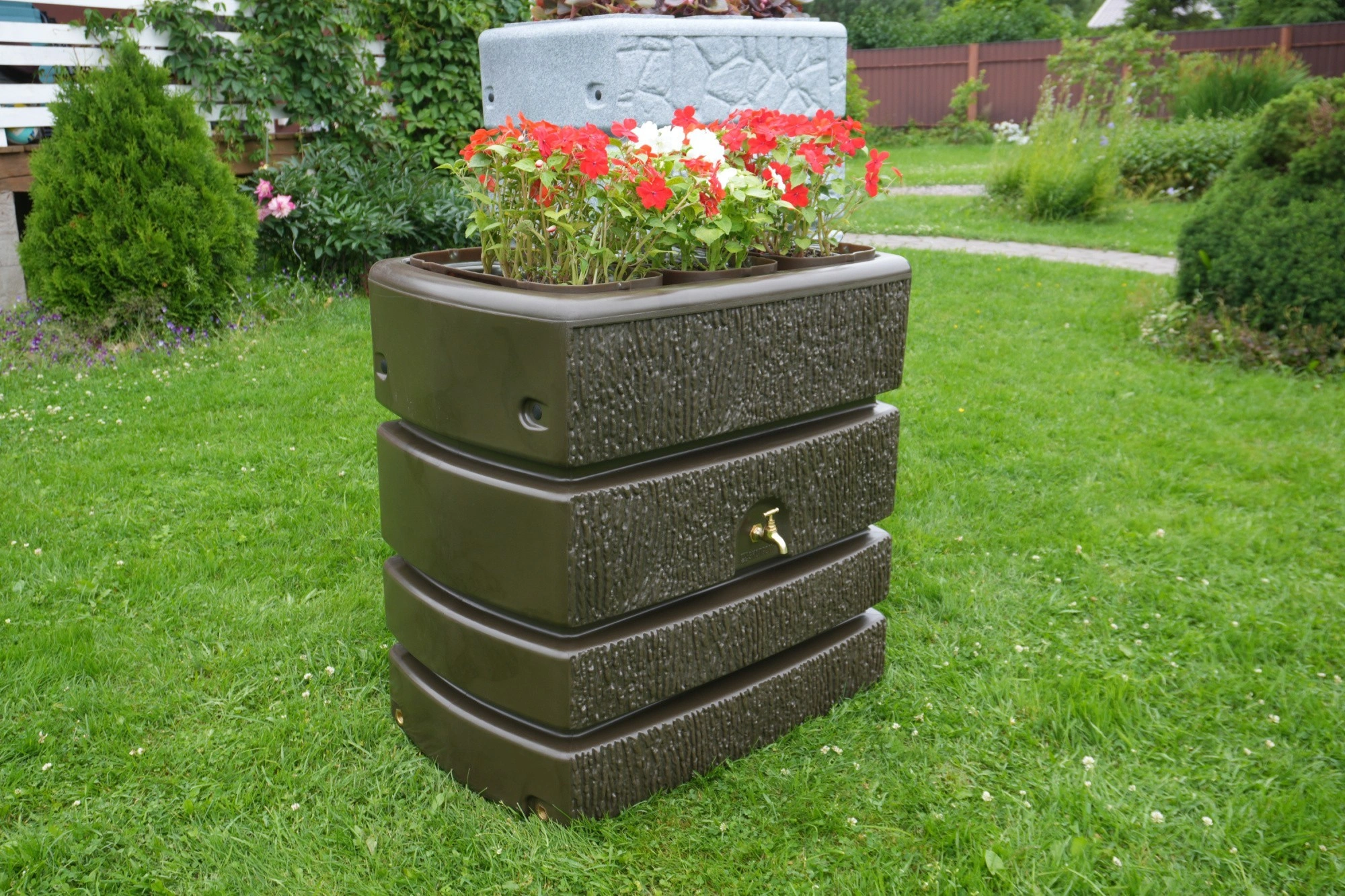 На верхней части изделия установлены три кашпо объёмом 3 литра каждая, что позволяет украсить цветами или другими растениями экстерьер загородного участка.