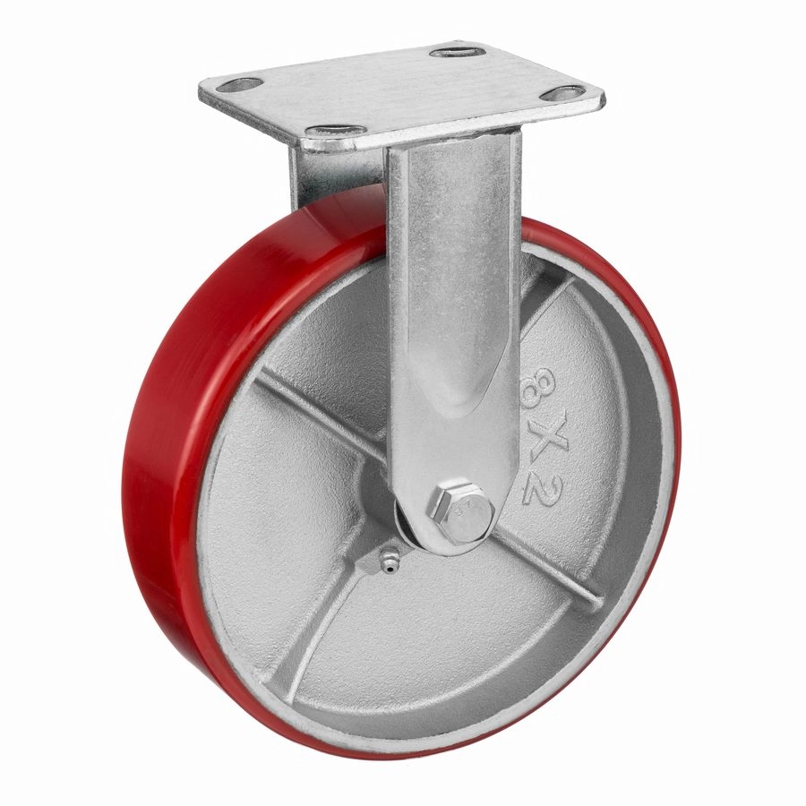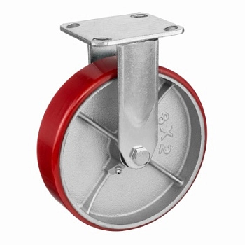 Колесо 1041-200, диаметр 200мм., чугун или полиуретан, неповоротное, игольчатый подшипник. Грузоподъемность 460кг. Колесо полиуретановое, центр из литого чугуна. В оси колеса-игольчатый подшипник. Стойкий к боковым ударам неповоротный кронштейн. Наличие масленки позволяет периодически обслуживать подшипник оси колеса. Крепление площадка под 4 болта. Колеса полиуретановые с чугунным сердечником широко применяются на бетонных полах преимущественно внутри помещений. Широко используются на тележках, строительных лесах и другом оборудовании, где требуется высокая грузоподъемность. При длительном нахождении под большой нагрузкой не деформируются. Возможно использование вне помещении на твердых покрытиях. Температура эксплуатации от -20 до +50С.