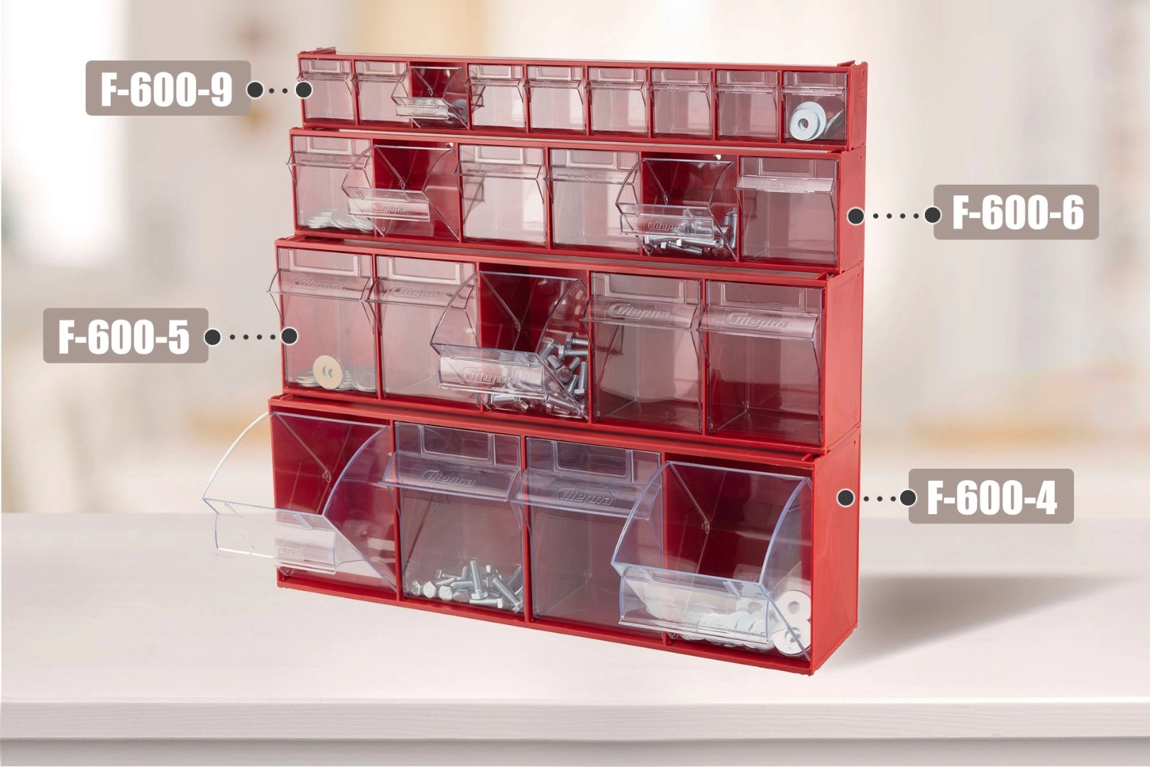 Короб откидной Стелла-техник F-600-5 (600х140х168мм.) 5 ячеек, красный, прозрачный служит для хранения мелкоштучных предметов. Данная система хранения не подвержена случайному опрокидыванию. Откидные стандартные ячейки обеспечивают быстрый доступ к необходимым предметам. В случае необходимости полного высыпания или наполнения внутренние ячейки легко извлекаются. Полезный внутренний размер каждой ячейки 108х98х107мм. Специальный пластик, из которого выполнен короб, выдерживает значительные нагрузки и обладает оптимальной эластичностью. На основе данных коробов можно сформировать многоярусную систему хранения вертикально, в том числе и с коробами других размеров, таких как F-600-9, F-600-6 и F-600-4 по принципу пирамиды. Использование в качестве дополнительного элемента специальных металлических рам, позволяет комплекту коробов нести большие нагрузки в напольном, настольном и настенном варианте. Короб данной модели легко можно прикрепить к стене или установить на специальные кронштейны (Артикул: Кронштейны-FOX-750). Обзорность содержимого сквозь прозрачные внутренние ячейки, наличие отсека для информационных бирок, легкое извлечение внутреннего короба для опустошения и наполнения, все это является неоспоримым преимуществом откидных коробов серии F. Температура эксплуатации от -10 до +70С.