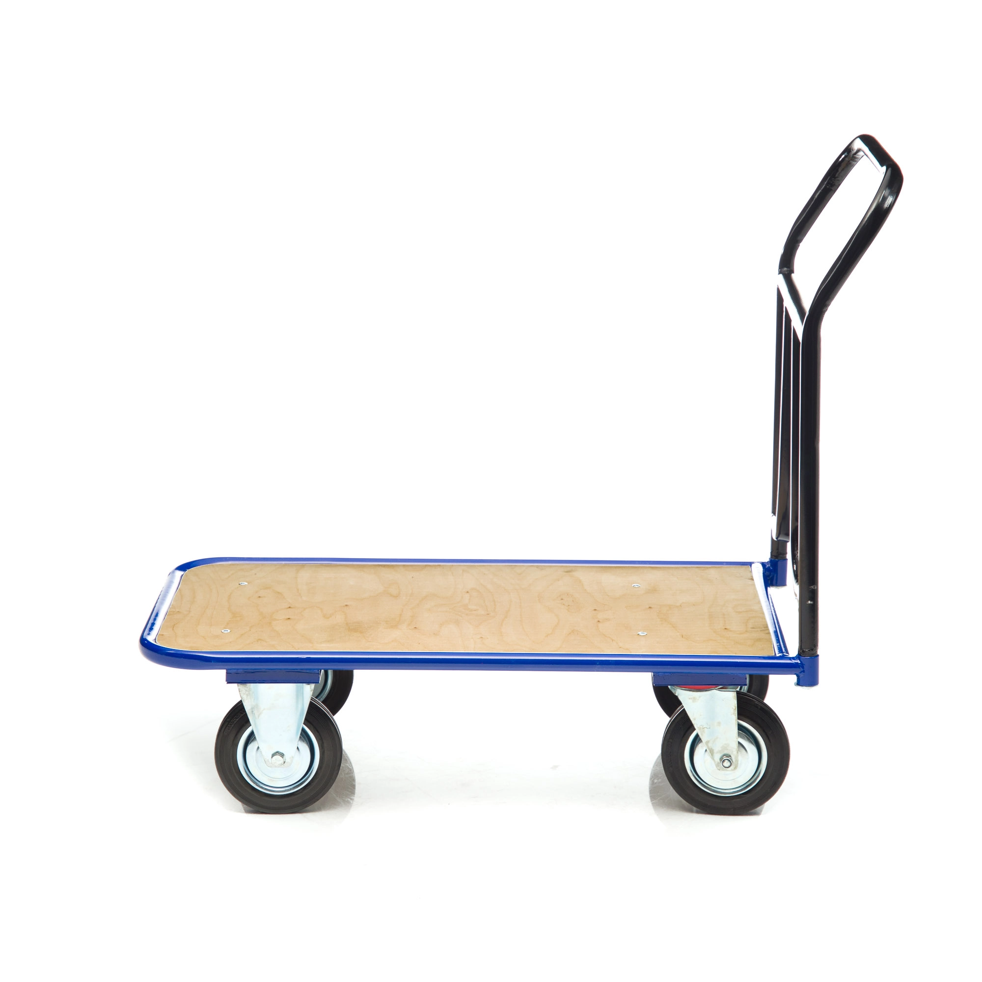 Платформенная 4-х колесная тележка КП-500-150-И (с фанерой) используется для перемещения различных грузов в складских помещениях. Каркас платформы изготовлен из металлической трубы диаметром 28мм., настил из фанеры толщиной 12мм. Размер платформы 600х1000мм. Ручка тележки снимается для компактного хранения. Ручка крепится к платформе болтами. Высота ручки 750мм. Покрытие металлических деталей тележки полимерное. Цвет - синий. Для легкого перемещения тележка комплектуется: двумя поворотными и двумя неповоротными промышленными колесами, диаметром 150мм., из черной стандартной резины, от всемирно известного, ведущего итальянского производителя Tellure Rota, метизами для крепления. Платформа с основанием из фанеры, обеспечивает устойчивое положение груза во время транспортировки. Легкая, малогабаритная тележка применяется на складах, в торговых павильонах, возможно использование и в бытовых целях. Грузоподъемность до 450кг.